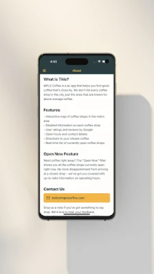 ✔ Find Nearby Coffee Shops – Discover top-rated local coffee spots based on your location. ✔ Statewide Coverage – Explore independent cafes beyond the Twin Cities, across Minnesota. ✔ Detailed Shop Information – View hours, location, and what each shop specializes in. ✔ Support Local Businesses – Highlighting only independent coffee shops, no big chains. ✔ Filter by Open Now status – Find only the coffee shops that are close to you and open right now.