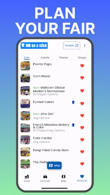 Interactive Map: Find your way around the fair with ease using our built-in navigation. Live Search: Quickly locate food vendors, events, and more. Events Schedule: Stay up-to-date with all the activities and performances happening at the fair. New Food: Explore the latest food offerings for this year. Wishlist: Plan your fair experience by adding your must-see attractions and must-try foods.